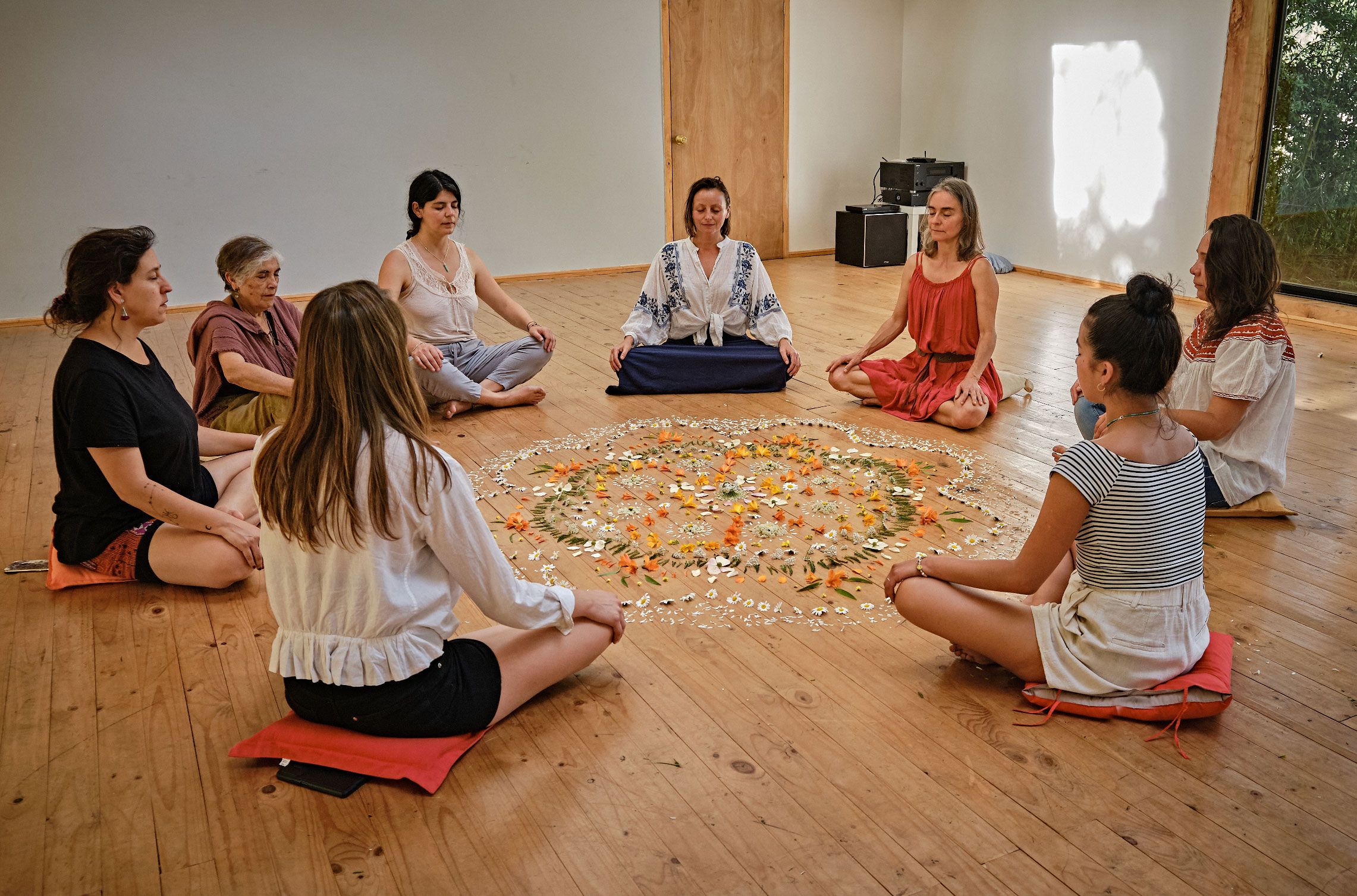 Esta es una práctica contemplativa, de construcción colectiva y colaborativa. En esta actividad nos introducimos al mundo de los sentidos a través de la meditación aromática, condicionando al grupo a un estado contemplativo para dedicarnos a la construcción y el progreso conjunto de un Círculo Floral. Esta rigurosa práctica nos recuerda estar en el presente, estimula la creatividad, la colaboración, la armonía y el respeto. Es una excelente herramienta para promover unión y cohesión de grupos humanos.